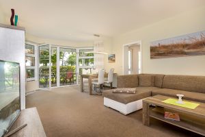 Im Wohnzimmer eine moderne Sitzcouch mit 2 Sesseln, Essecke für 4 Personen,