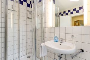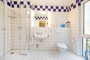 Bad mit großem Fenster, Dusche, Waschbecken, WC, Föhn und Heizkörper
