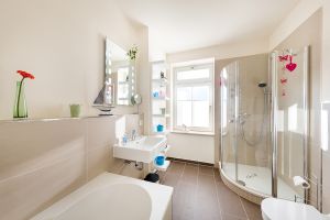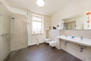 Bäder mit großem Fenster, Dusche, Badewanne , Waschbecken, WC, Heizkörper
