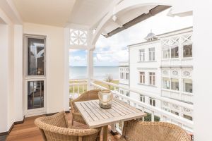 einen großen seitlichen Balkon mit direktem Blick auf die Ostsee und den Strand.