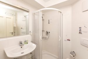 Bad mit Dusche, Waschbecken, WC, Heizkörper