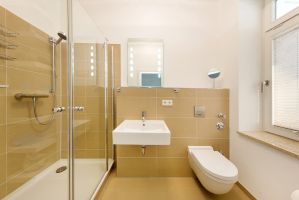 Bäder mit großem Fenster, Duschen, Waschbecken, WC, Heizkörper