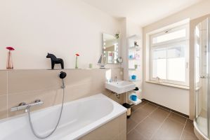 Bäder mit großem Fenster, Dusche, Badewanne , Waschbecken, WC, Heizkörper